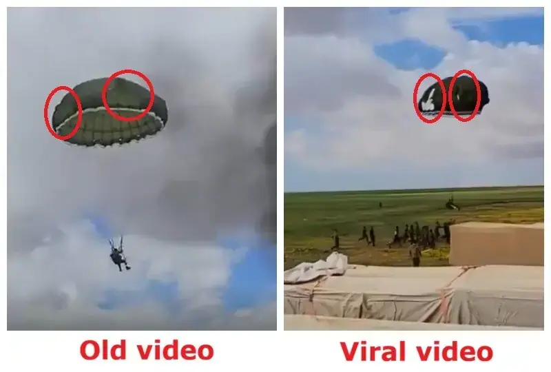 The comparison also shows the same parachute, with distinct holes visible in its canopy, appearing in both videos. This unique feature further confirms that the footage is identical and has been misrepresented with a false claim.