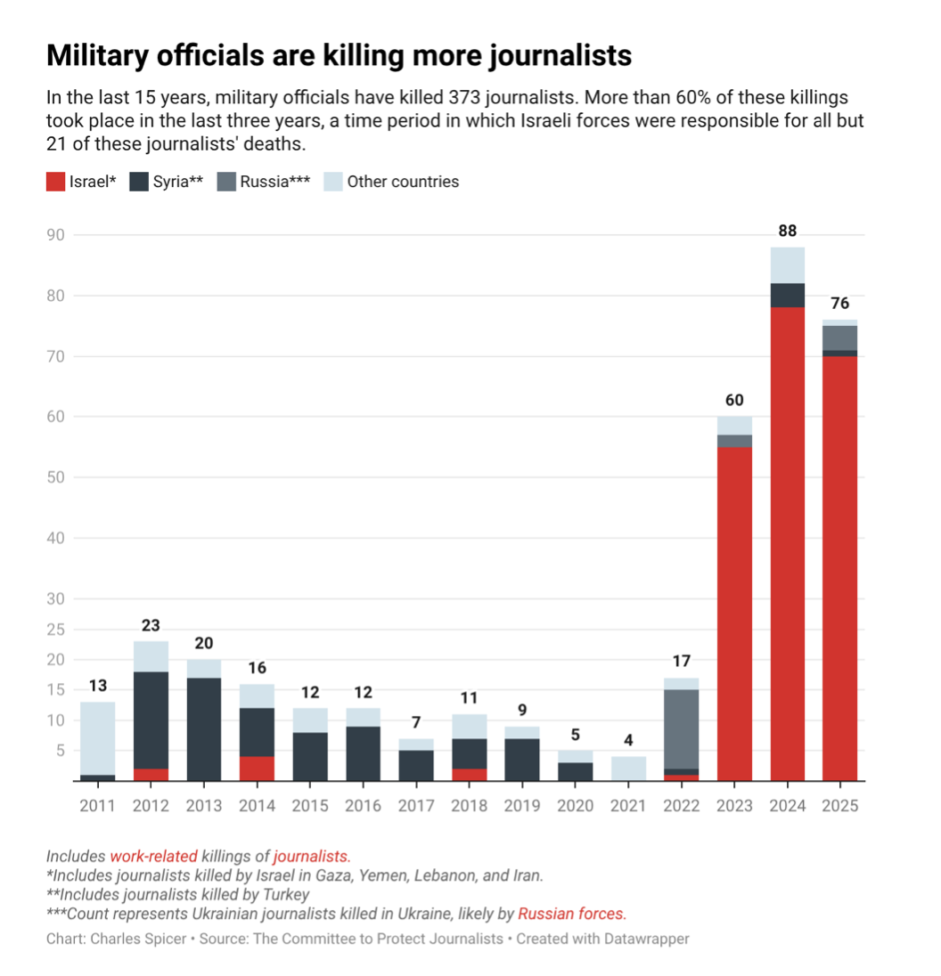 According to the report, more than three-quarters of journalists killed last year died in conflict zones. Ukraine saw four deaths and Sudan nine, only slightly higher than in 2024. Gaza, by contrast, still bore far heavier losses, with Israel responsible for the majority. Since the group began tracking targeted killings of media workers three decades ago, the Israel Defense Forces have been responsible for more such deaths than any other state military.