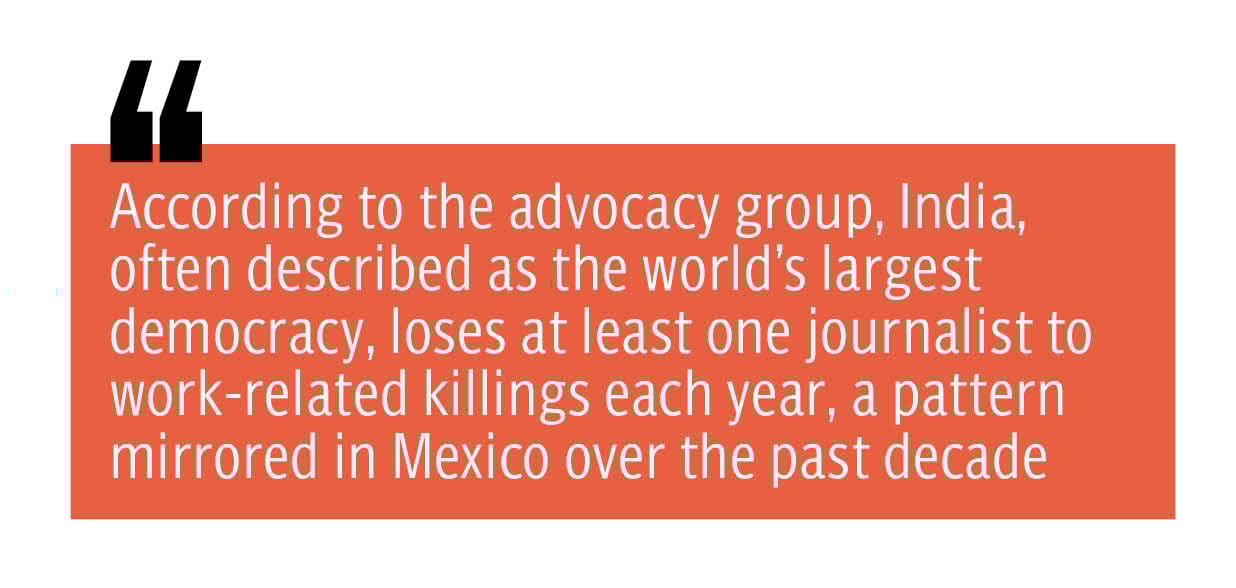In its 12-page report, the CPJ also flags dangers outside war zones. According to the press freedom group, India, often described as the world’s largest democracy, loses at least one journalist to work-related killings each year, a pattern mirrored in Mexico over the past decade.