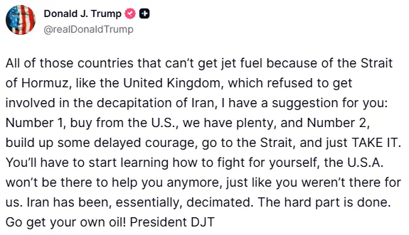 Trump has derided Britain’s offer to send more military assets to the region, and even as the state visit was being announced, he launched yet another verbal assault on countries that had failed to help and were now struggling to get jet fuel, singling out the United Kingdom.