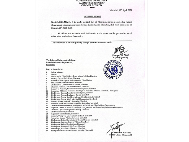 According to an official notification, “all ministries, divisions and other federal government establishments located within the Red Zone Islamabad shall work from home on Monday, April 20.”