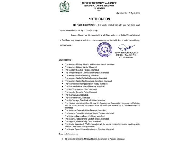 In a separate order issued by the Islamabad Capital Territory District Magistrate Irfan Nawaz Memon, the district administration announced that “entry into the Red Zone shall remain suspended on April 20 Monday,” requesting that “all offices and schools, public and private, situated in the Red Zone may adopt a work-from-home arrangement to avoid any inconvenience.”