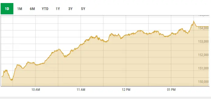 The index gained 4,276.09 points, or 2.85 per cent, to stand at 154,292.25 points from the previous close of 150,016.16 points.