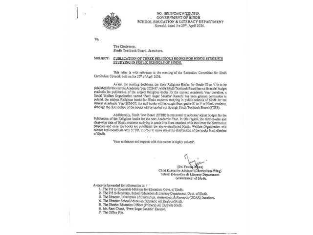 Therefore, a social welfare organisation, “Prem Sagar Sanstha”, Karachi, was granted permission to publish the subject religious books for Hindu students studying in public schools of Sindh for the academic year 2026–27, the notification stated.