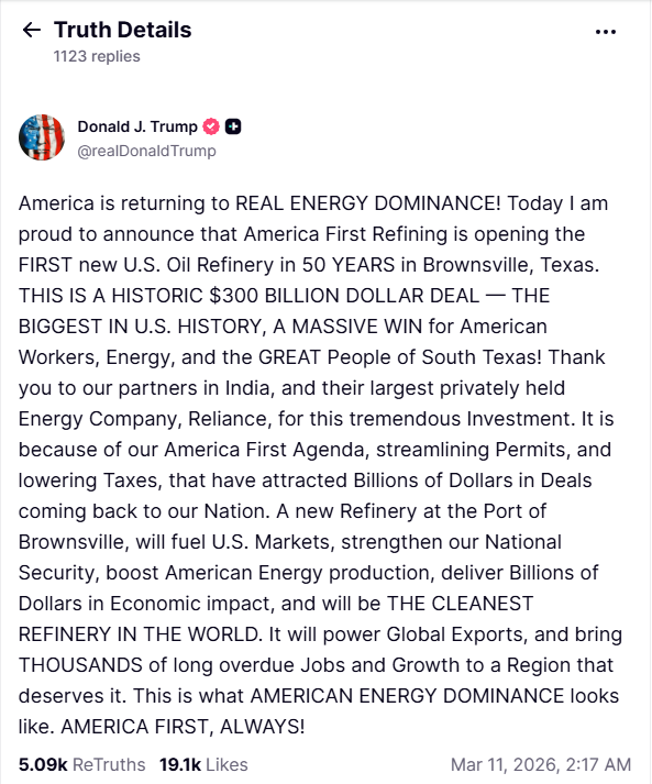 The new refinery will “fuel US markets, strengthen our national security, boost American energy production, deliver billions of dollars in economic impact, and will be the cleanest refinery in the world,” Trump said on Truth Social.