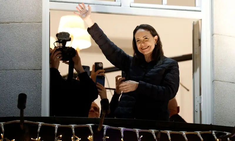 Nobel laureate and Venezuelan opposition leader Maria Corina Machado emerged from hiding to make her first public appearance in almost a year, waving to supporters from the balcony of her Oslo hotel early on Thursday.
